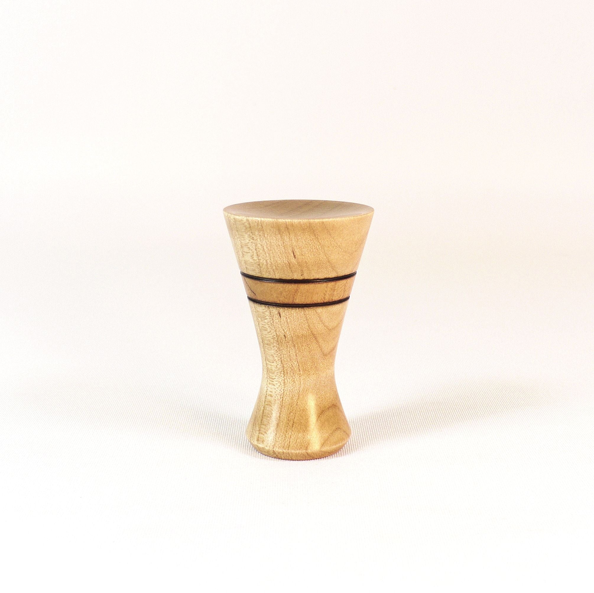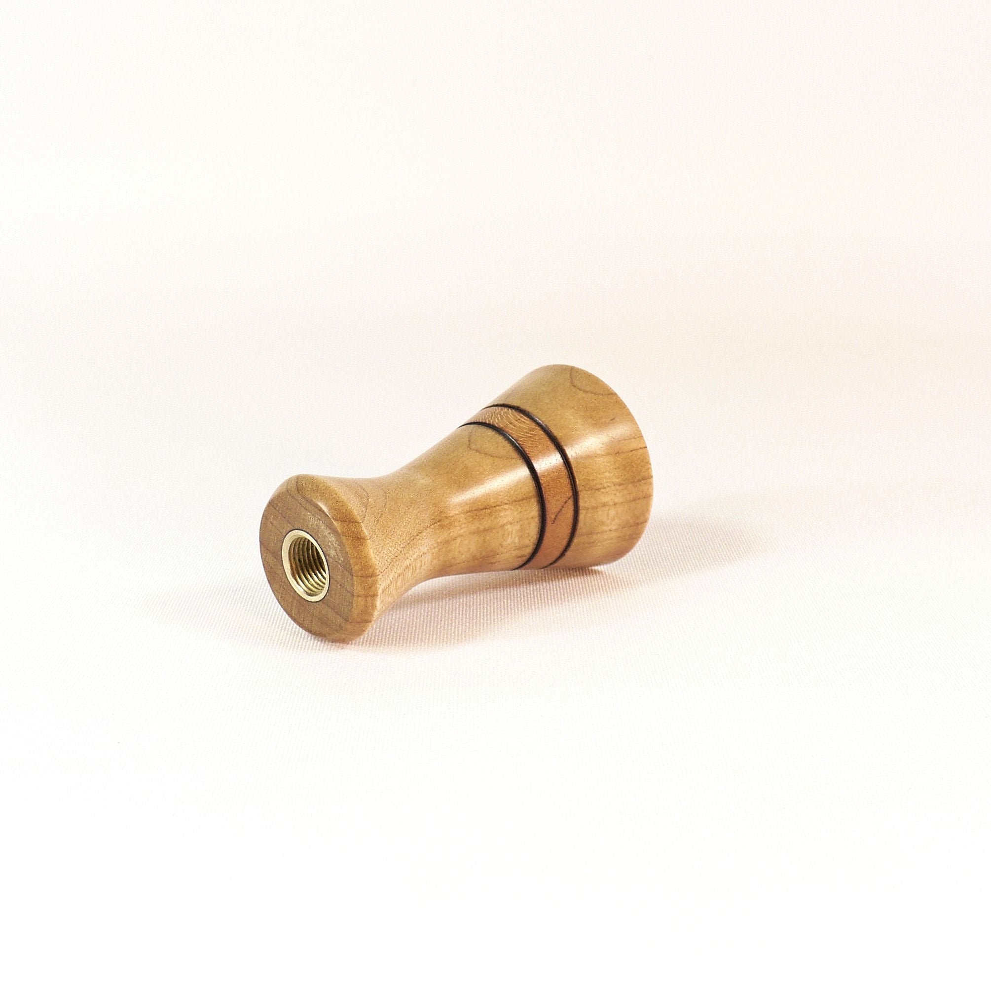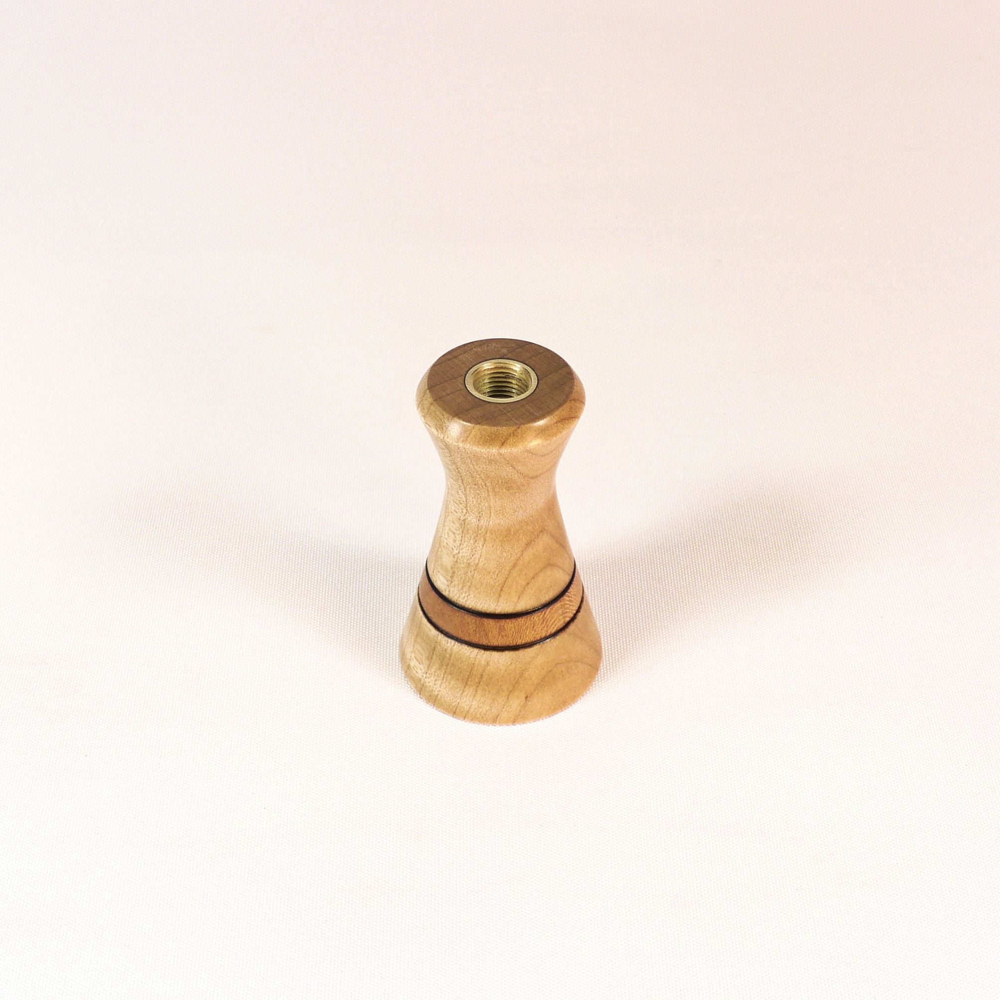 This is a custom pendant lamp finial for Arthur in Bow pattern 6B1, handmade in curly maple with a cherry stripe. It measures approximately 2.5" tall x 1.5" diameter at the widest point and it has a rubbed oil finish. The top end of the finial is fitted with an inset brass threaded sleeve to fit a 1/8 i.p.s. post on the lamp. Thank you Arthur.