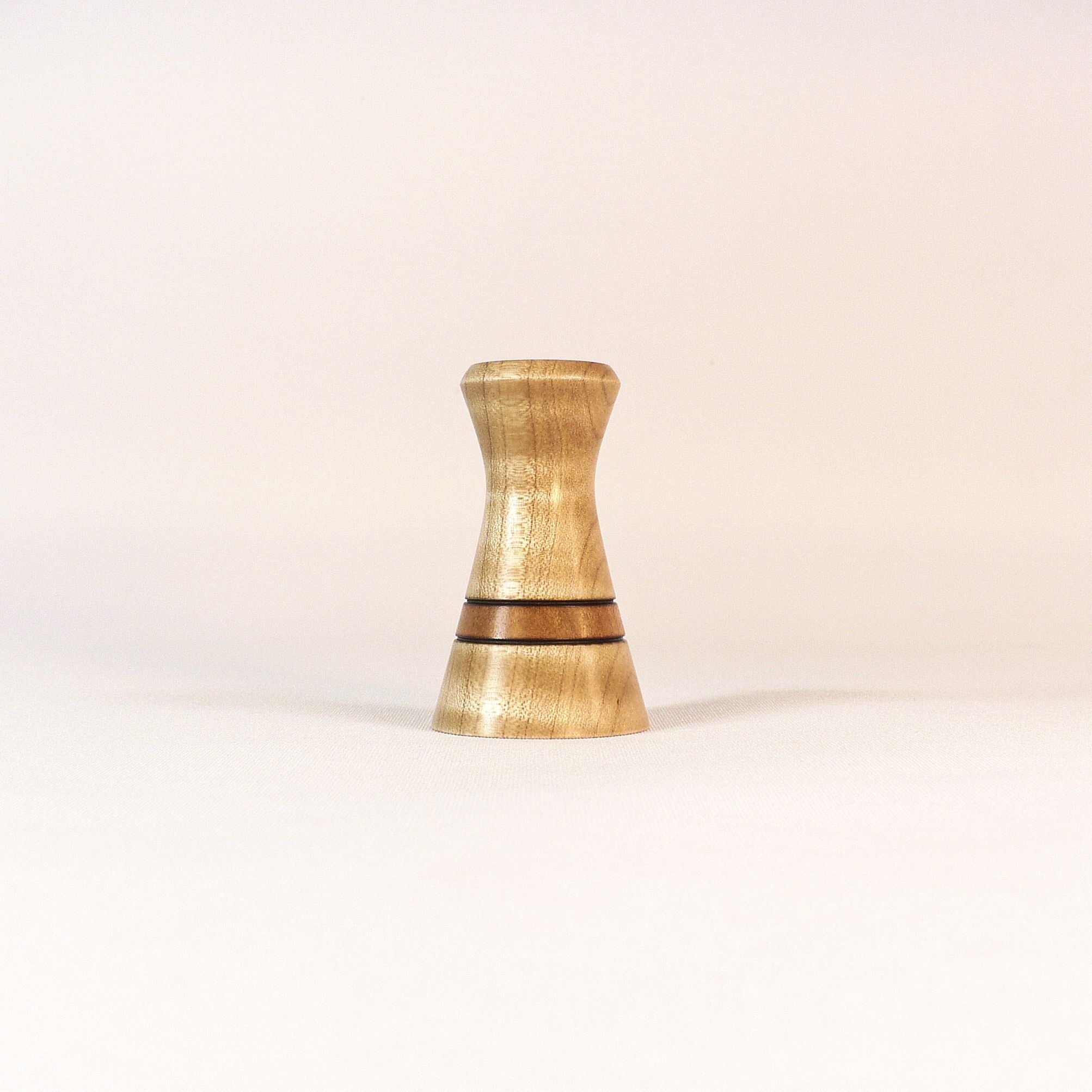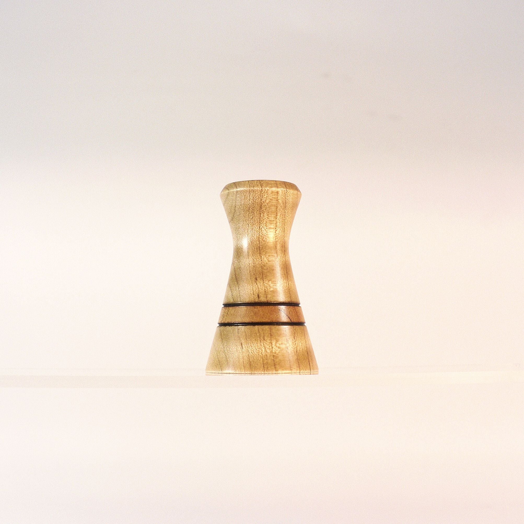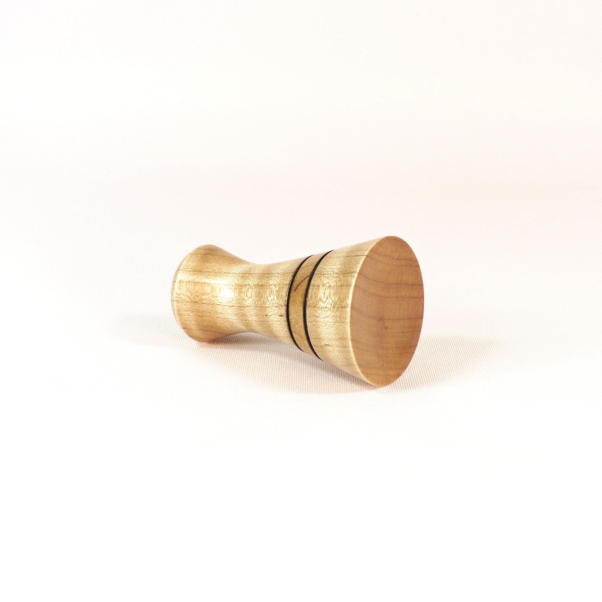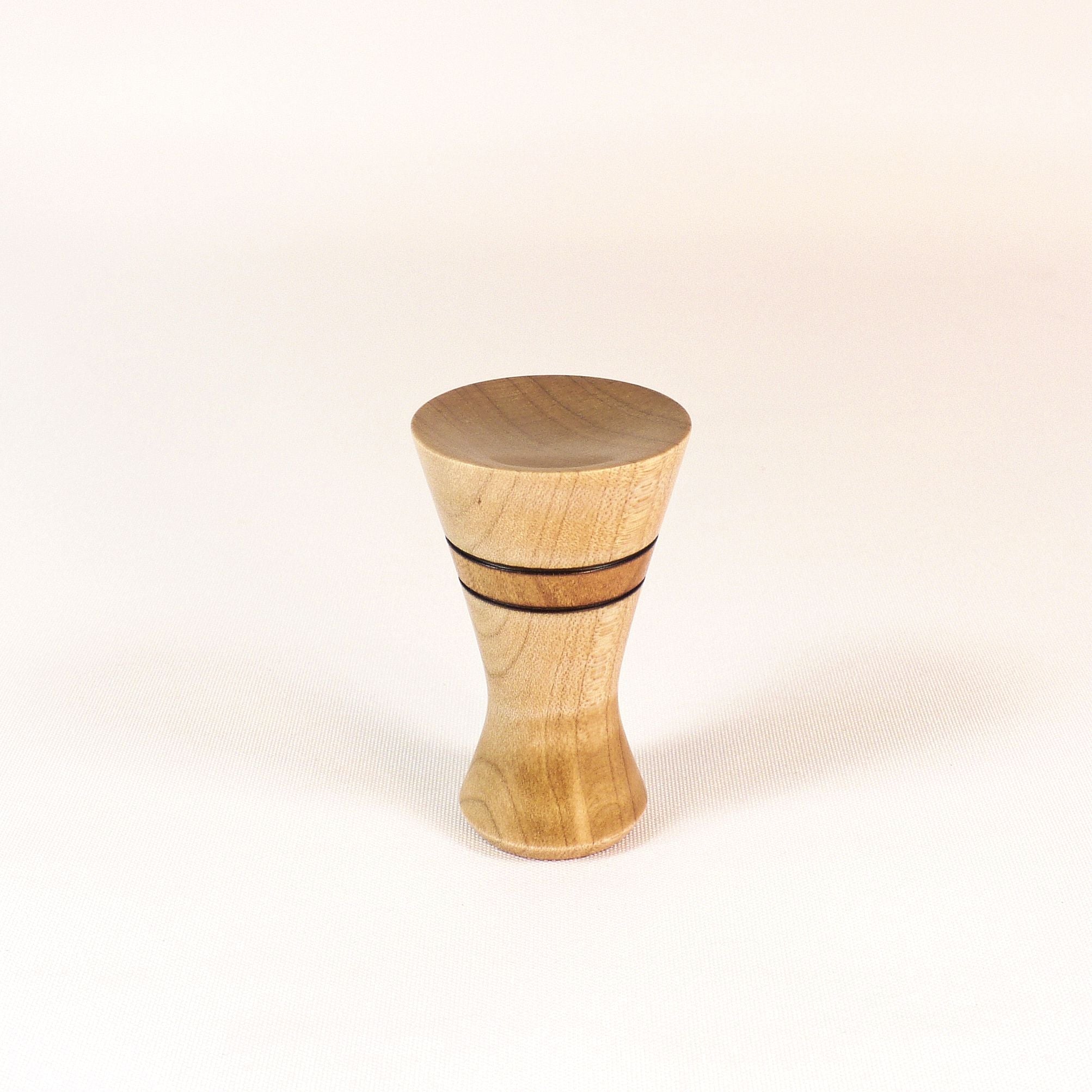 This is a custom pendant lamp finial for Arthur in Bow pattern 6B1, handmade in curly maple with a cherry stripe. It measures approximately 2.5" tall x 1.5" diameter at the widest point and it has a rubbed oil finish. The top end of the finial is fitted with an inset brass threaded sleeve to fit a 1/8 i.p.s. post on the lamp. Thank you Arthur.